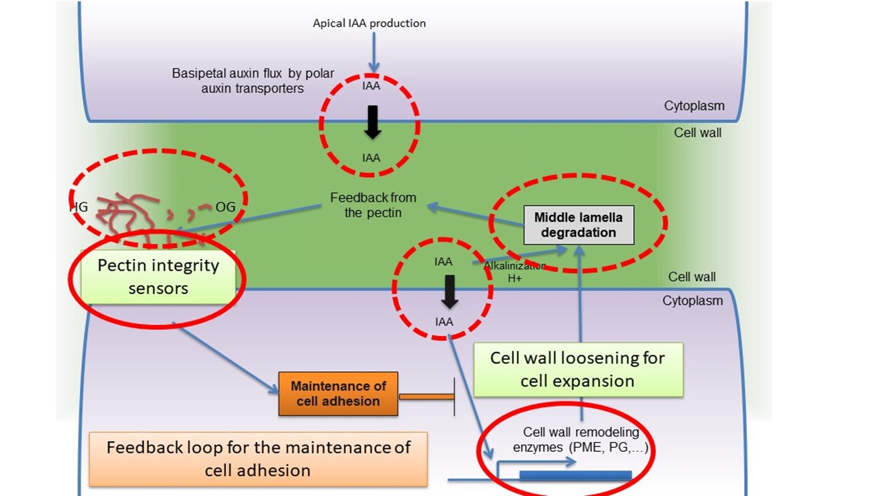 Despite their importance, the mechanisms of biosynthesis, transport, deposition and maturation of these polymers are still very poorly understood. Furthermore, the impact of polymer modifications on the mechanical properties of the wall and in particular the control of cell adhesion remains to be elucidated. In order to better understand these processes we combine molecular genetic, biochemical and cytological approaches using as model plants the Arabidopsis thaliana, but also cultivated species such as rice and tomato.